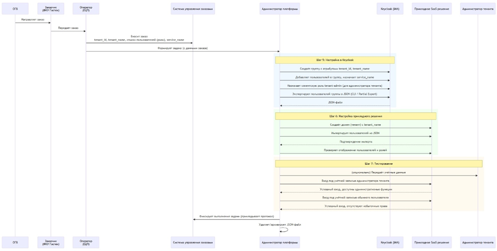 - Администратор платформы (или, при разделении, Администратор прикладного сервиса) передаёт JSON-файл (через защищённый канал внутри контура) и приступает к настройке прикладного SaaS решения: