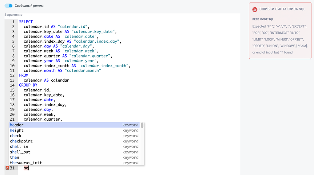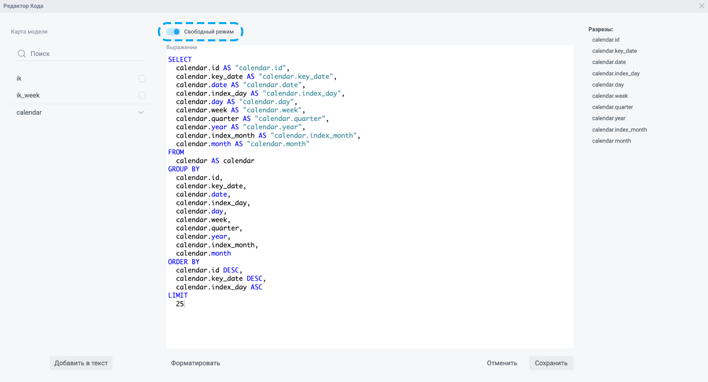 В настройке виджетов SQL-редактора появился переключатель «Свободный режим», открывающий доступ к сплошному редактору SQL.