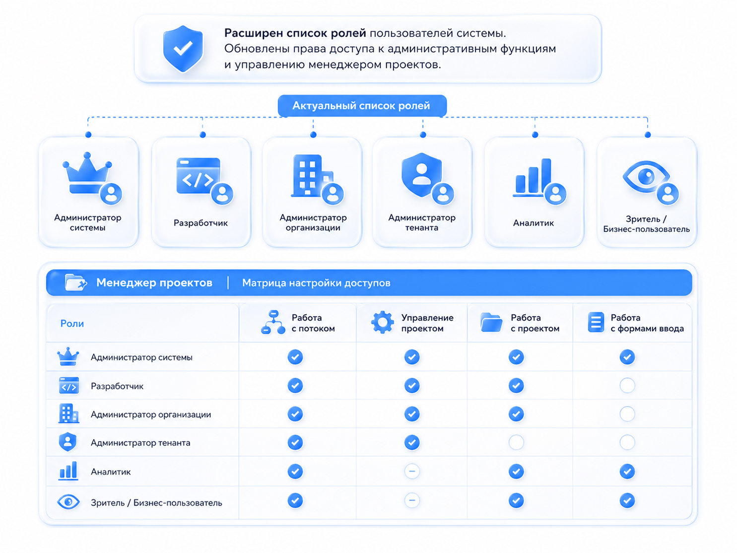 Расширен список ролей пользователей системы. Обновлены права доступа к административным функциям и управлению менеджером проектов.