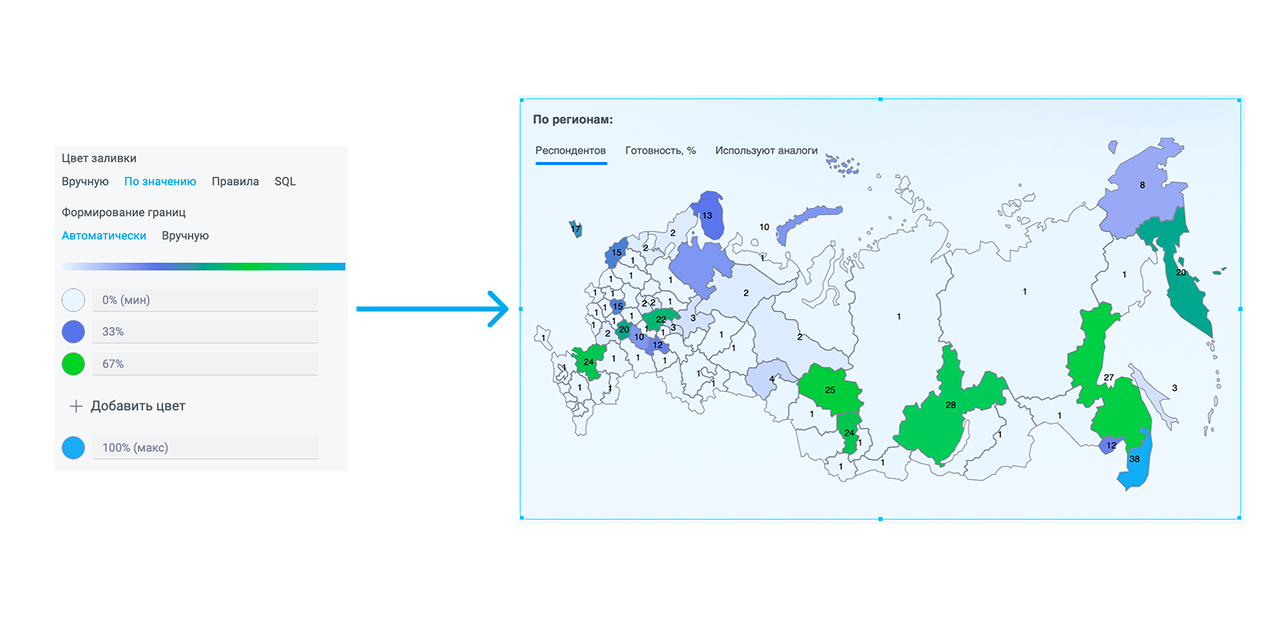 Настройка доступна во всех элементах, поддерживающих изменение цвета фона: визуализации, медиаблок, фильтры, вставка. Эффект применяется только при условии, что у контейнера задан фон с прозрачностью (opacity < 100%). Значение по умолчанию: 0 (без размытия).