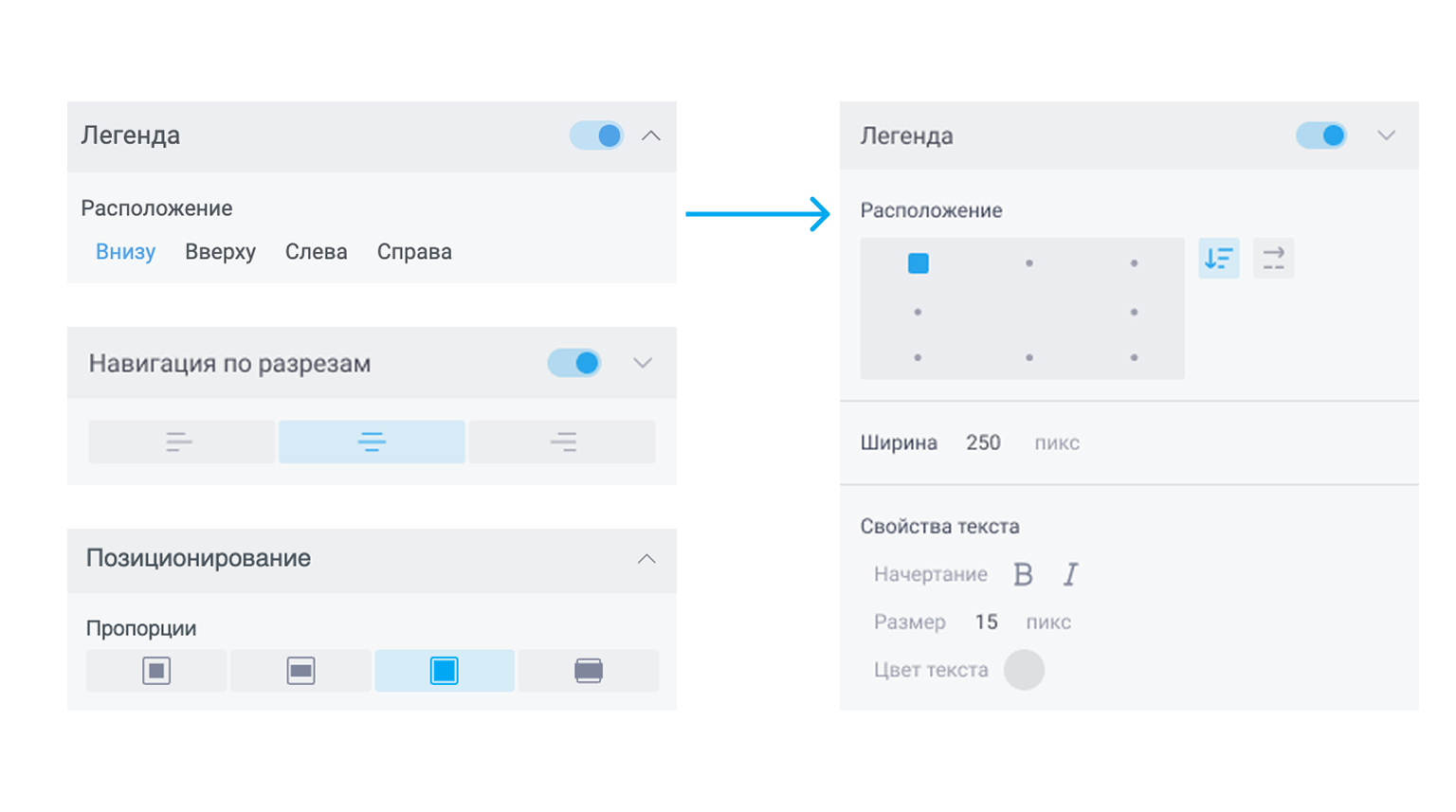 В настройках всех визуализаций текстовые обозначения сторон («Слева», «Справа», «Сверху», «Снизу») заменены на соответствующие иконки-стрелки. Интерфейс стал более компактным и интуитивно понятным.